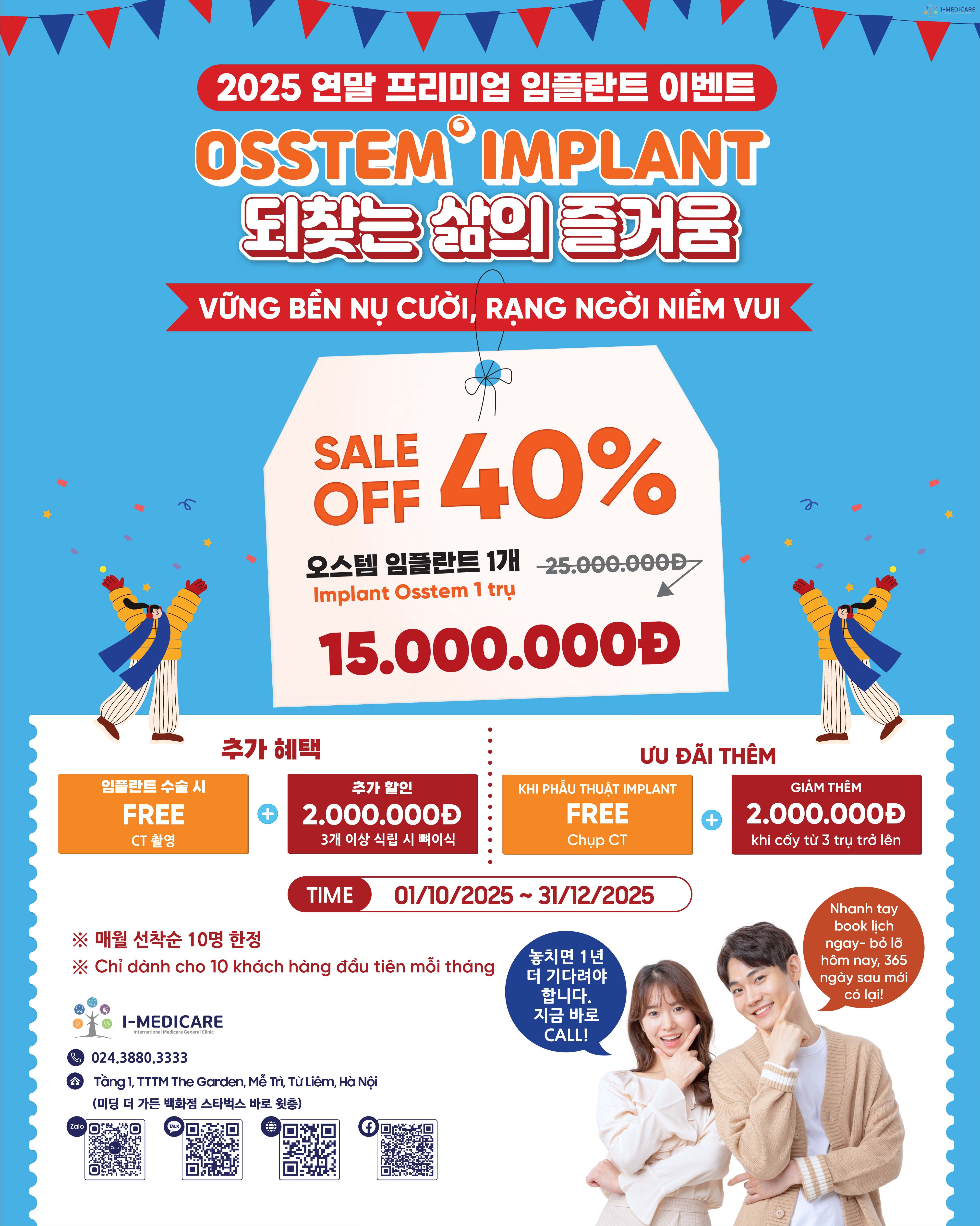 Một nụ cười trọn vẹn không chỉ là yếu tố thẩm mỹ mà còn là chìa khóa mang lại sự tự tin, thành công trong giao tiếp và công việc. Hiểu được điều đó, Phòng khám Đa khoa Quốc tế I-Medicare triển khai chương trình khuyến mãi đặc biệt cuối năm 2025 - giảm 40% dịch vụ cấy ghép răng Implant Osstem. Đây là cơ hội vàng để khách hàng lấy lại hàm răng chắc khỏe, duy trì nụ cười bền vững với chi phí tiết kiệm nhất.
