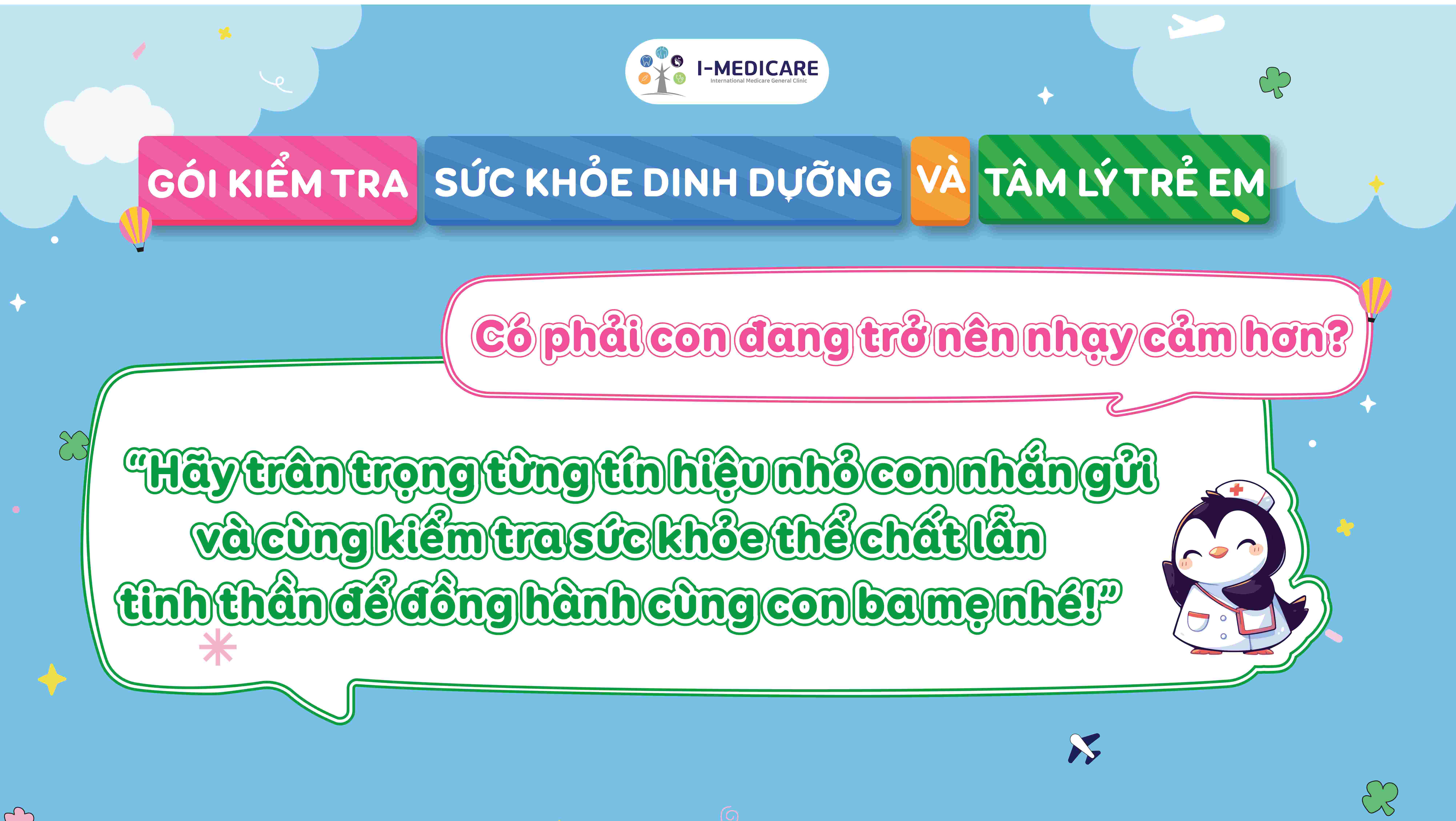 Trẻ em ngày nay có thể gặp nhiều vấn đề âm thầm về dinh dưỡng, miễn dịch và tâm lý mà cha mẹ khó nhận biết sớm. Thấu hiểu điều đó, Phòng khám I-Medicare triển khai Gói kiểm tra sức khỏe dinh dưỡng & tâm lý trẻ em, giúp phát hiện sớm các nguy cơ tiềm ẩn, đánh giá toàn diện thể chất lẫn tinh thần và đồng hành cùng ba mẹ trong hành trình chăm sóc sức khỏe con một cách khoa học, cá nhân hóa.