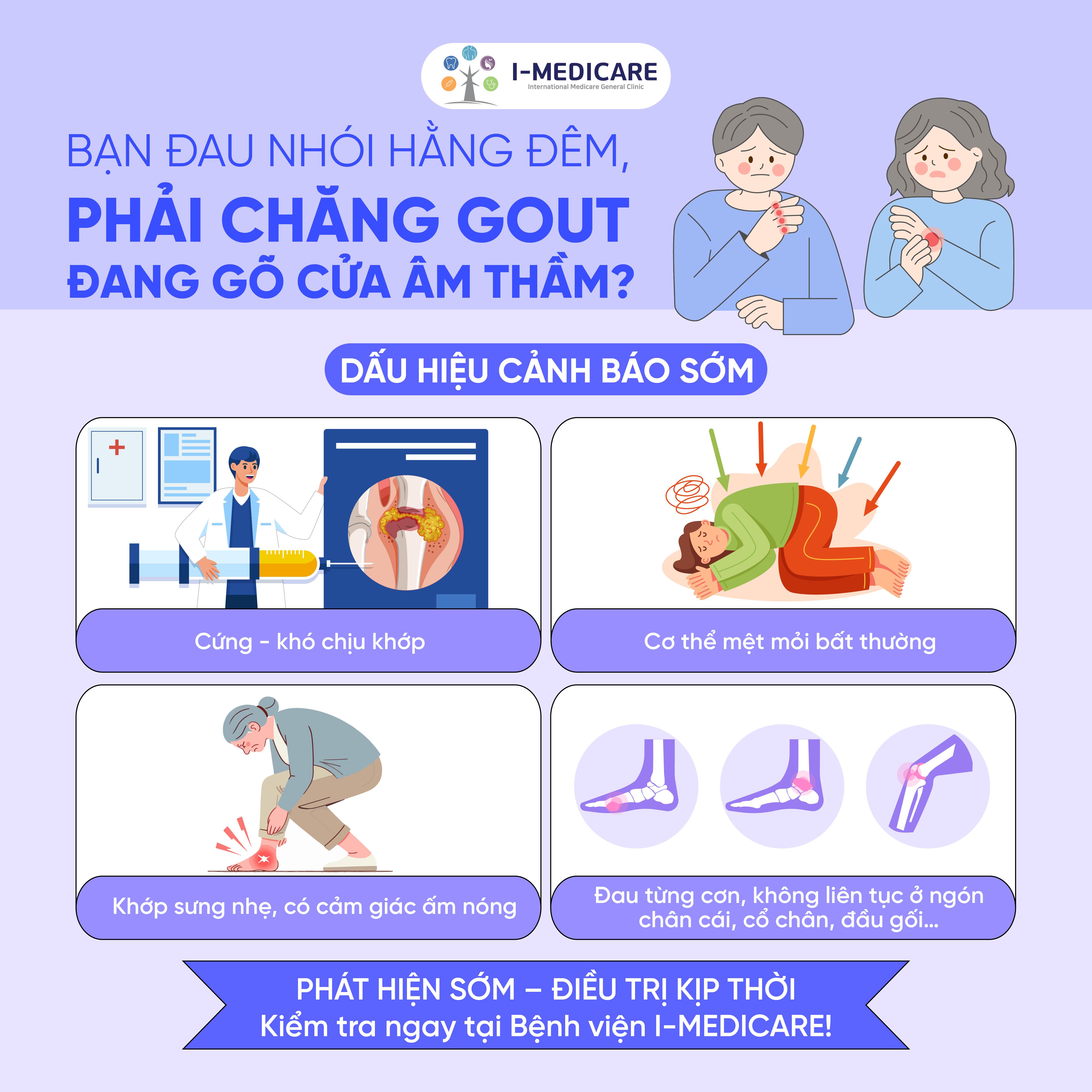 Kiểm tra và tầm soát gout ngay tại Phòng khám đa khoa I-MEDICARE với đội ngũ bác sĩ chuyên khoa giàu kinh nghiệm, hệ thống xét nghiệm hiện đại và phác đồ điều trị cá nhân hóa, an toàn – hiệu quả.