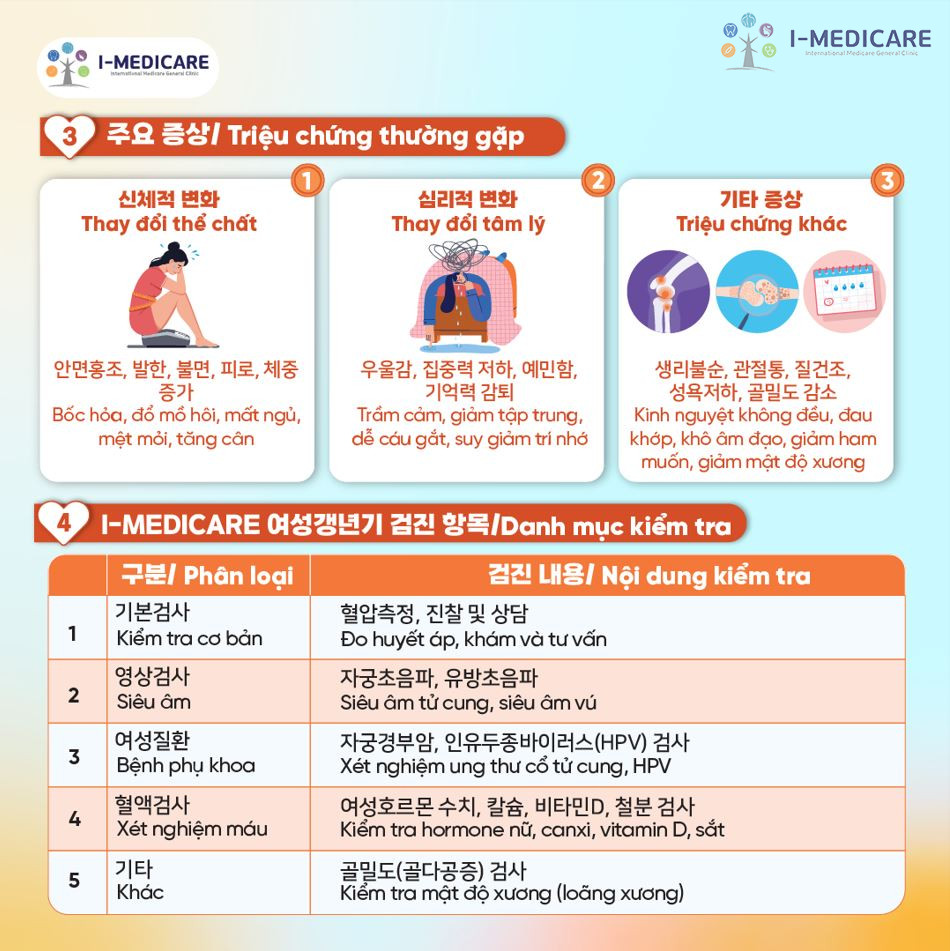 Chương trình kiểm tra sức khỏe mãn kinh tại I-MEDICARE được thiết kế toàn diện, giúp phụ nữ hiểu rõ tình trạng sức khỏe hiện tại và phòng ngừa sớm các nguy cơ tiềm ẩn.