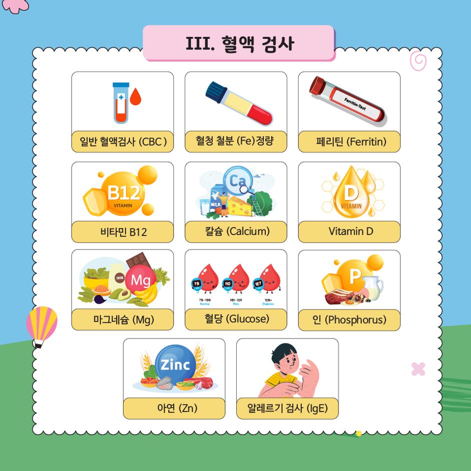 이러한 지표를 통해 미량영양소 결핍, 빈혈, 혈당 이상, 알레르기 또는 면역 저하 여부를 조기에 확인할 수 있으며, 이는 아이의 성장, 두뇌 발달 및 행동에 직접적인 영향을 미칩니다.