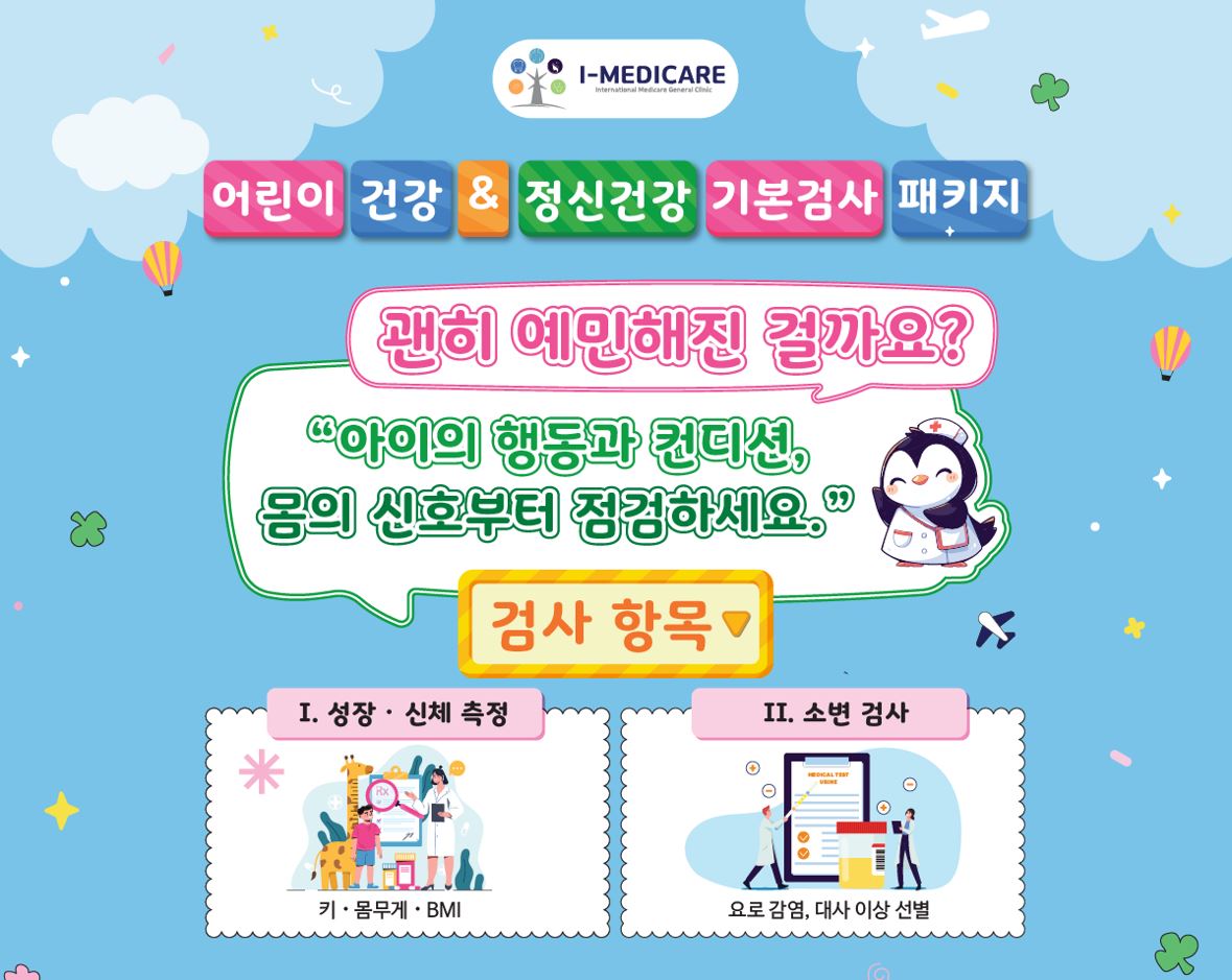 I-Medicare 종합 클리닉은 아이의 신체적·정신적 건강을 전반적으로 돌보며, 부모님과 함께 아이가 건강하고 자신감 있게 성장할 수 있도록 지속적으로 동행할 것을 약속드립니다.