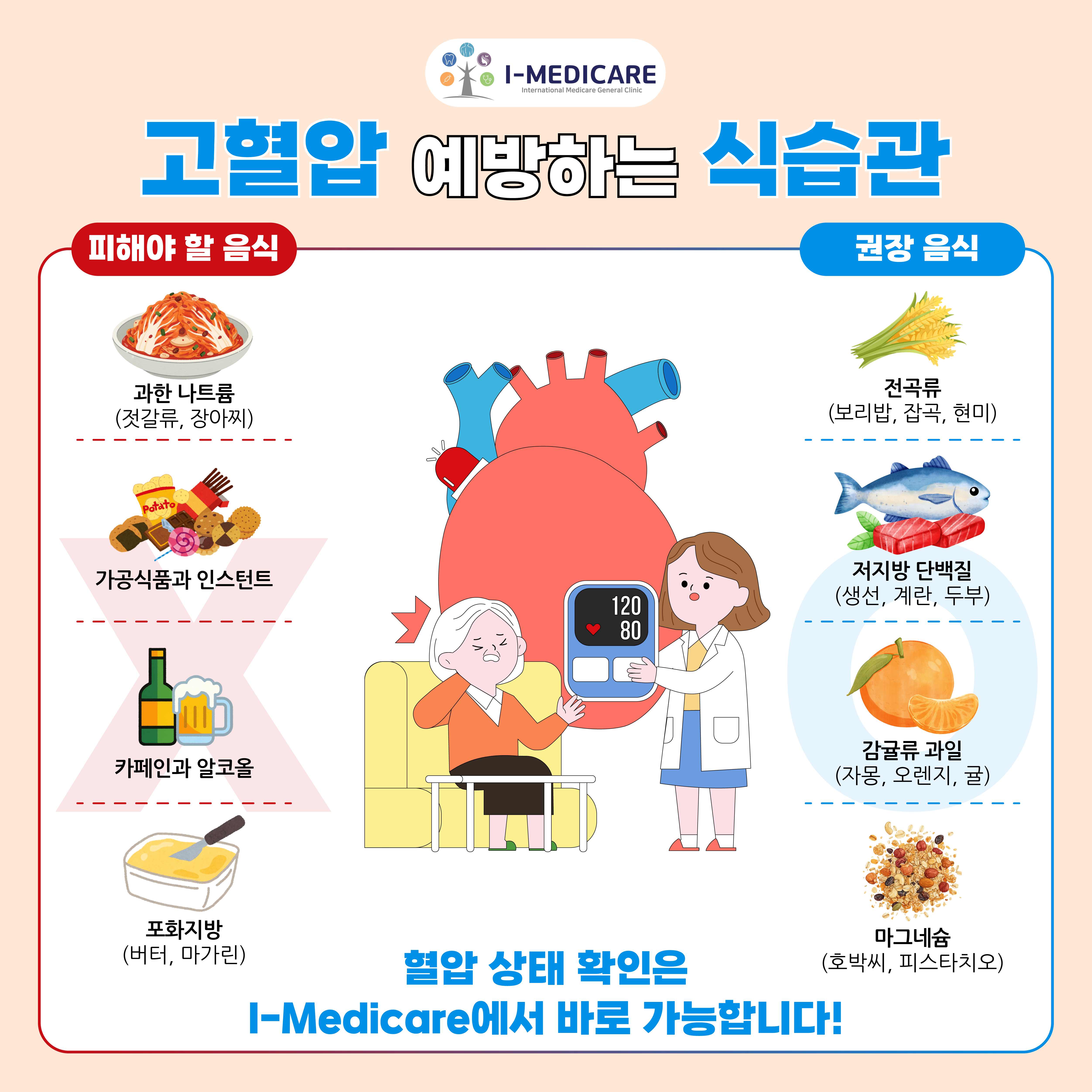 고혈압은 올바른 식단과 생활습관으로 충분히 예방하고 관리할 수 있는 질환입니다. 작은 식습관의 변화가 큰 건강의 차이를 만듭니다. 지금 바로 I-Medicare에서 혈압 상태를 확인하고, 건강한 삶을 위한 첫걸음을 시작하세요.