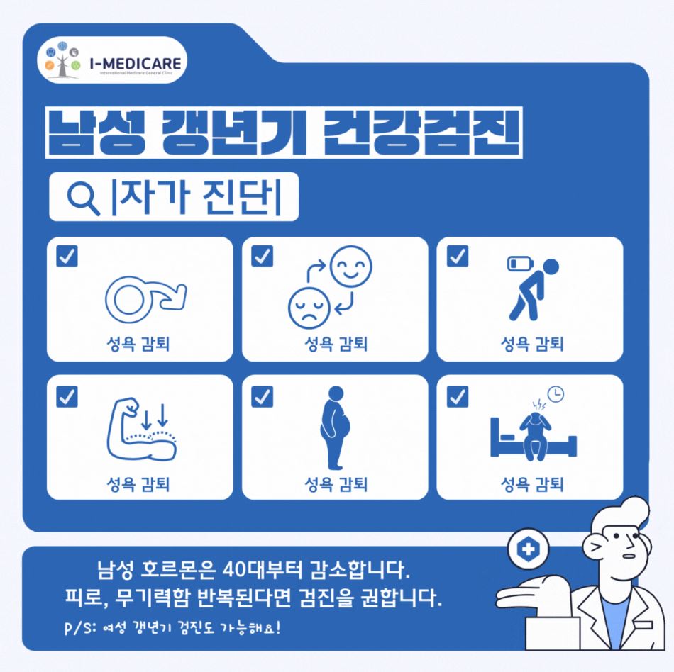 I-MEDICARE 중년 남성 건강검진 패키지는 여러분이 스스로 건강을 지키고, 질환을 예방하며, 삶의 질을 높일 수 있는 최적의 선택입니다.