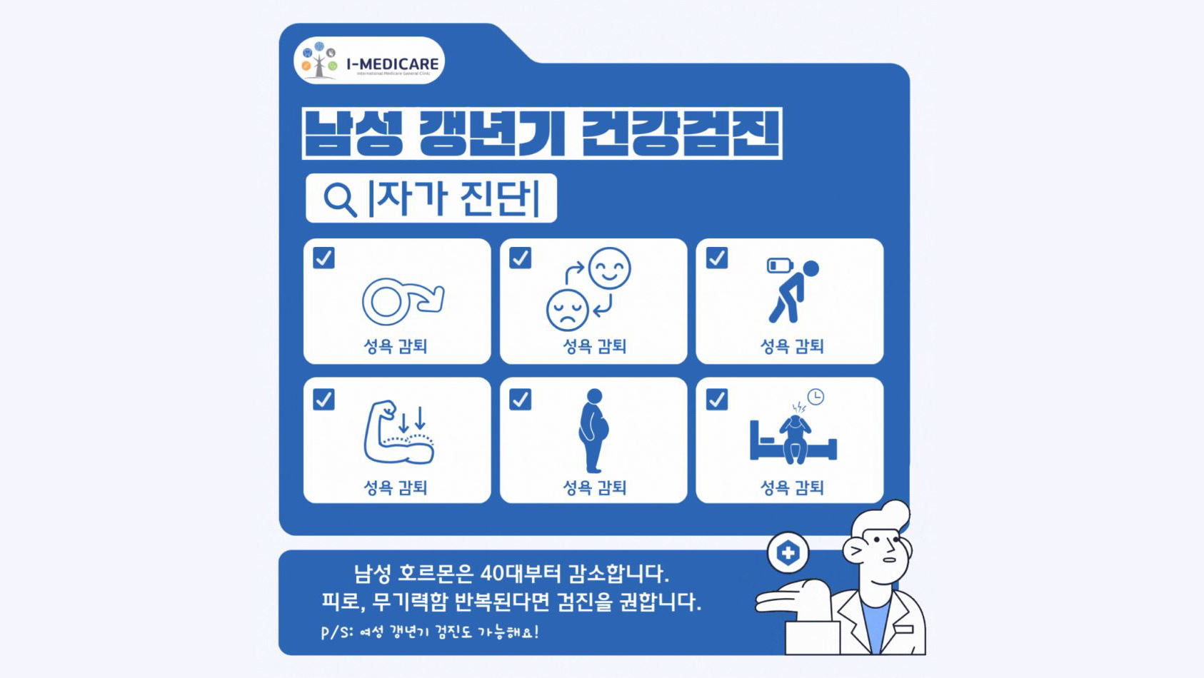 40세 이후 남성은 성욕 감소, 피로, 수면장애, 복부 지방 증가 등 신체적·정신적 변화에 직면하게 됩니다. I-MEDICARE 중년 남성 건강검진 패키지는 이러한 변화를 조기에 발견하고, 호르몬 이상 및 만성질환을 예방하며 건강한 활력과 자신감을 유지할 수 있도록 설계되었습니다.