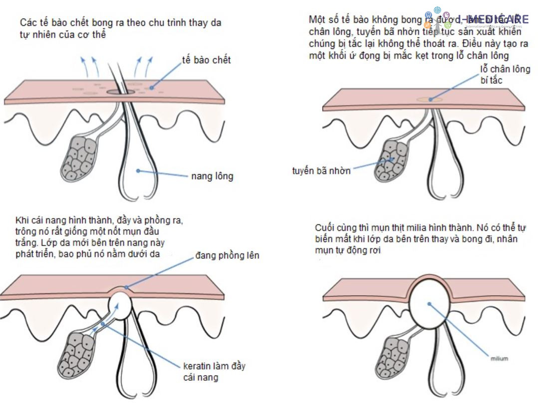 Trong khi đó, mụn sừng hình thành khi tế bào da chết và keratin bị mắc kẹt trong các nang lông hoặc tuyến bã nhờn nhỏ. Khi không có đường thoát ra ngoài, chúng tích tụ lại và tạo thành những nang nhỏ, cứng màu trắng ngà. Tình trạng này thường xuất hiện sau tổn thương da nhẹ như bỏng, tẩy da quá mức hoặc do da không bong tự nhiên hiệu quả.