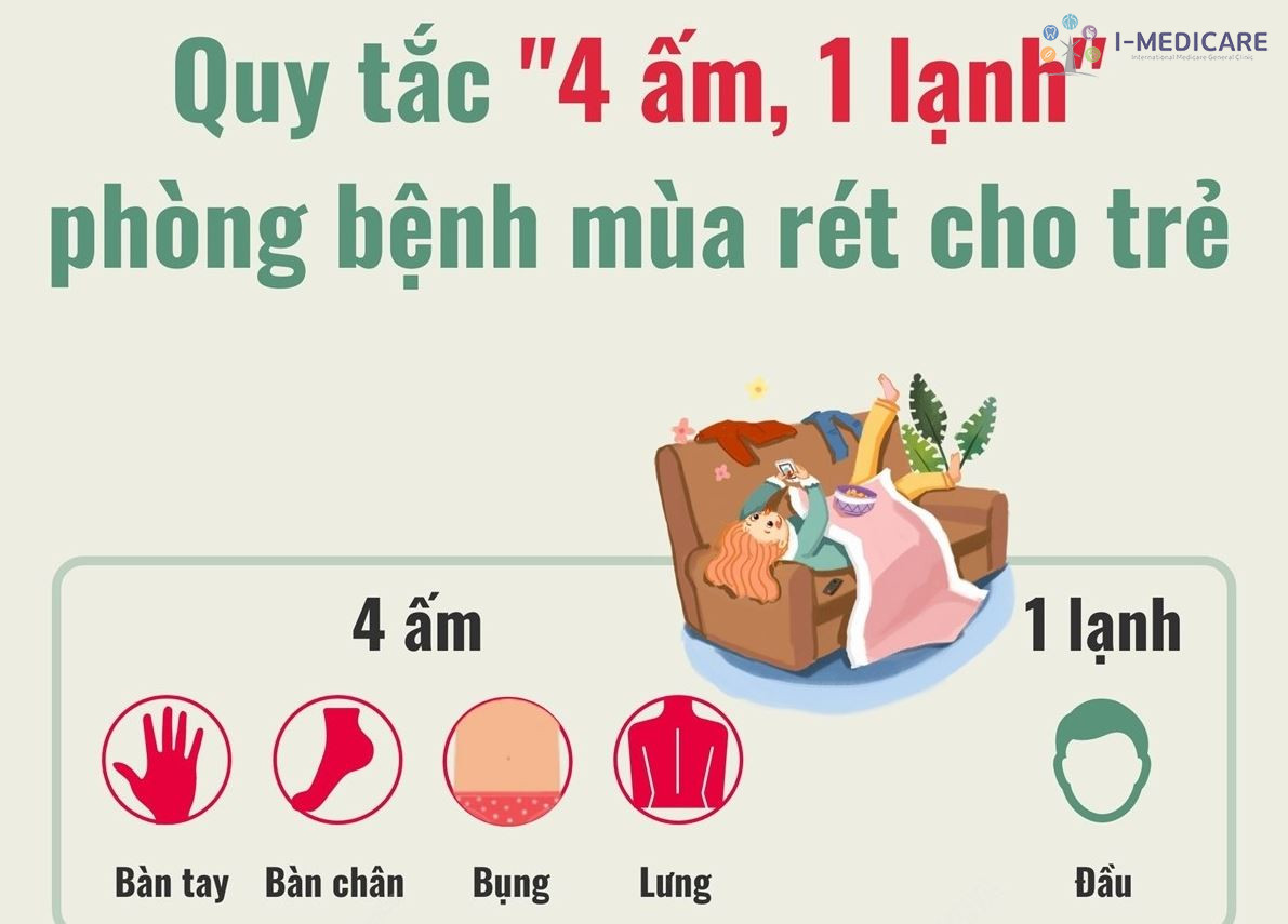 Nguyên tắc 4 ấm Giữ ấm đúng cách để bảo vệ sức khỏe toàn thân cho trẻ. 4 ấm trong nguyên tắc 4 ấm 1 lạnh là giữ ấm bàn tay, bàn chân, bụng và lưng. Đây là bốn vùng cơ thể dễ bị nhiễm lạnh và ảnh hưởng trực tiếp đến sức khỏe của trẻ nhỏ.