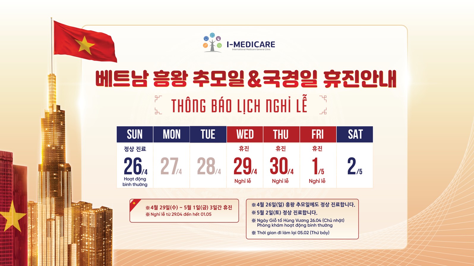 Phòng khám I-MEDICARE xin kính chúc Quý khách hàng cùng gia đình có một kỳ nghỉ lễ an toàn – vui vẻ – trọn vẹn bên người thân. Đừng quên theo dõi lịch hoạt động và quay lại thăm khám từ ngày 02/05 để tiếp tục hành trình chăm sóc sức khỏe toàn diện cùng chúng tôi.