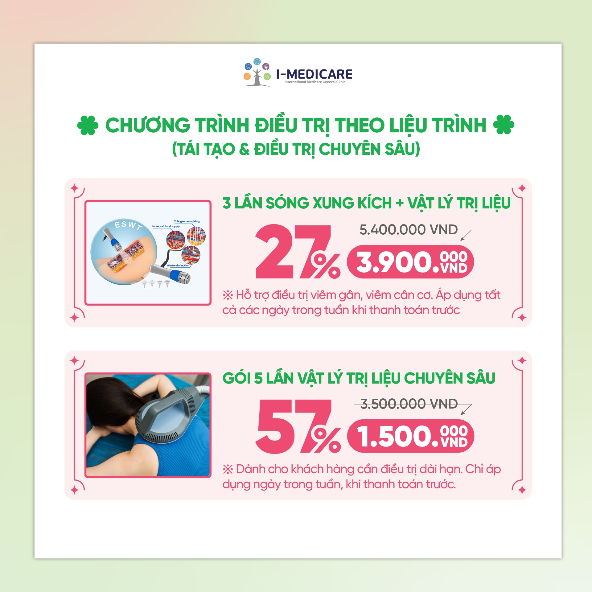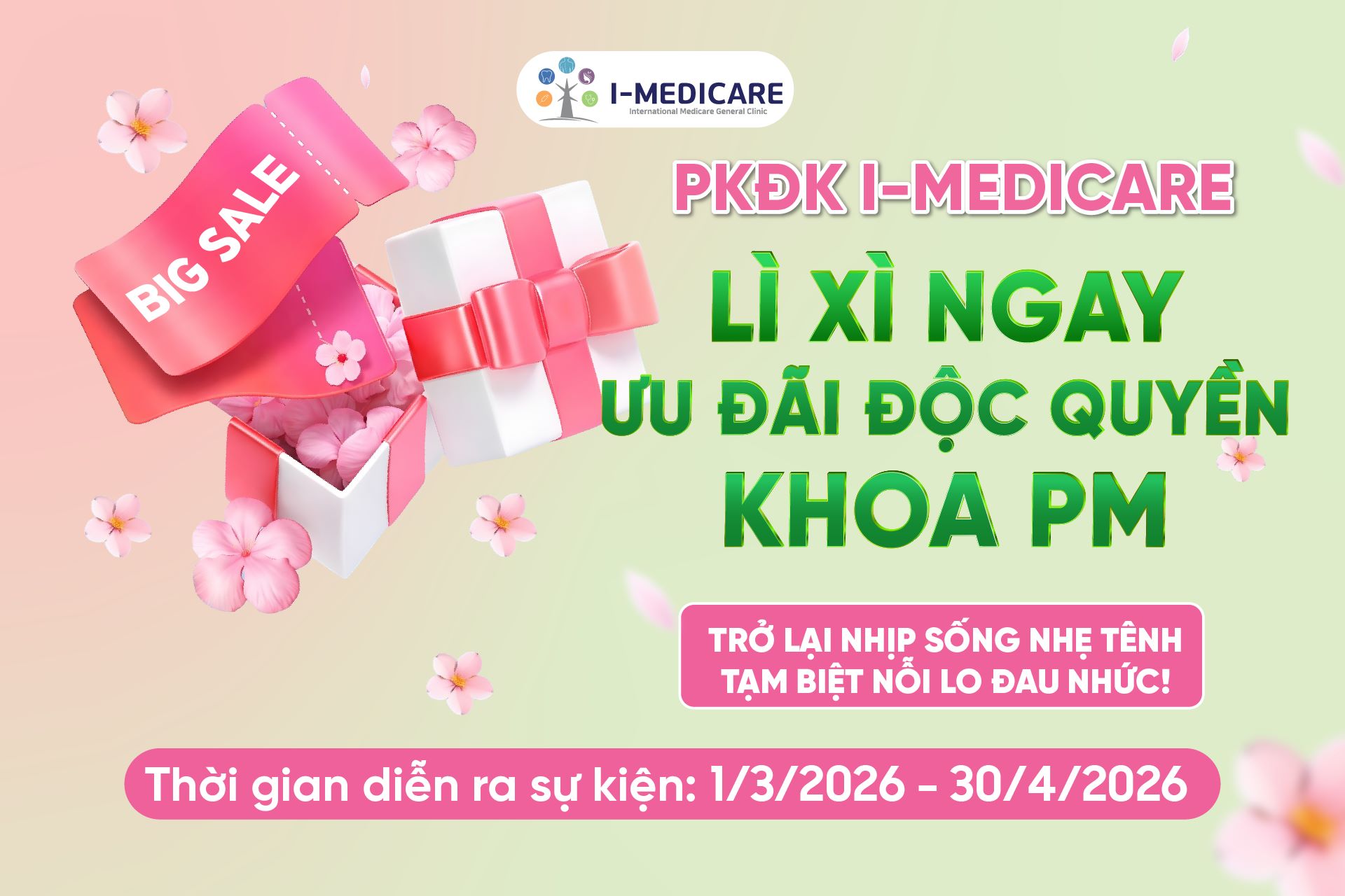 Chương trình ưu đãi khoa Phục hồi chức năng I-MEDICARE là cơ hội vàng để bạn chăm sóc sức khỏe xương khớp - phục hồi vận động - giảm đau bền vững với chi phí tối ưu nhất. Số lượng ưu đãi có hạn trong thời gian từ 01/03/2026 – 30/04/2026, vì vậy hãy đặt lịch sớm để không bỏ lỡ cơ hội “lì xì sức khỏe” giá trị này.